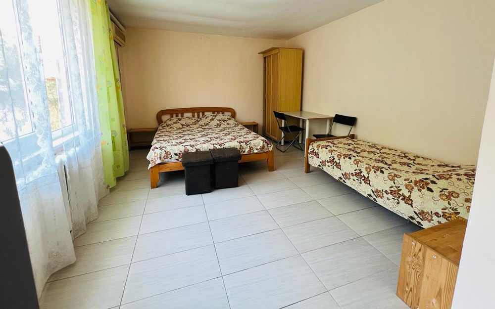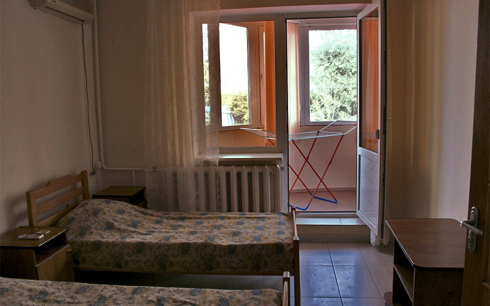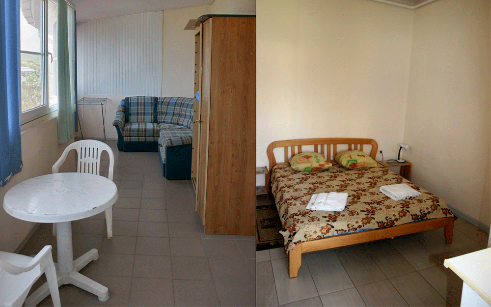 Трехместная комната с видом на море. Площадь 13 кв.м. Двухспальная кровать и угловой диван. Сплит-система, санузел, телевизор, холодильник, застекленная лоджия 17 кв.м..