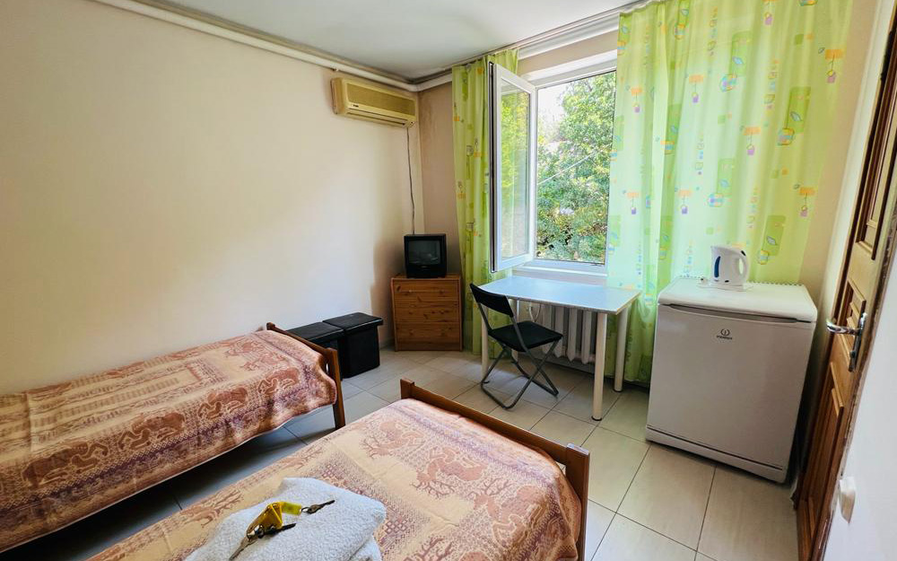 Трехместная комната. Площадь: 18 кв.м. Двухспальная и односпальная кровати. Сплит-система, санузел, телевизор, холодильник.
